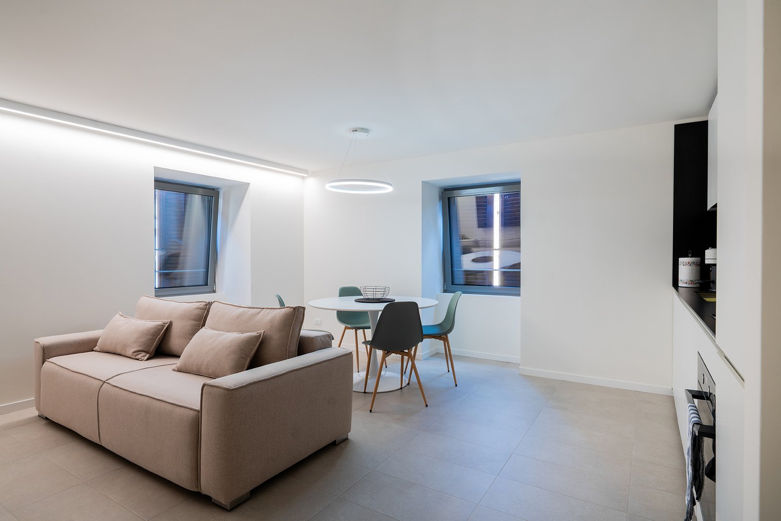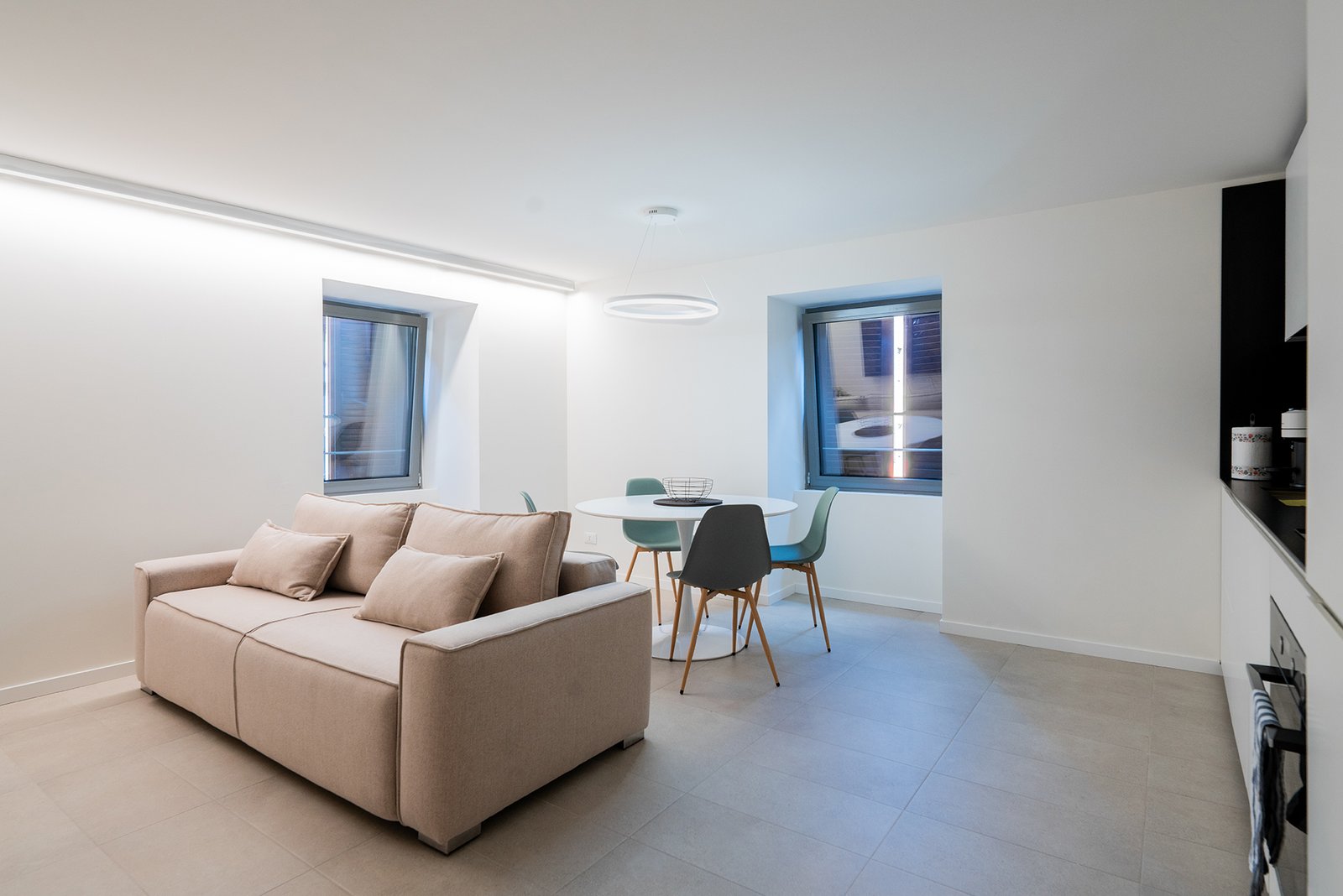 L’appartamento si apre poi su un luminoso soggiorno con cucina a vista, arricchito da due finestreche donano luce naturale durante tutto il giorno. La cucina è completamente accessoriata: lavastoviglie, lavatrice, macchina del caffè, frigorifero, piano cottura e tutti gli utensili essenziali per sentirsi come a casa, anche per soggiorni più lunghi.